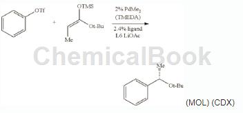 在充满氩气的手套箱中,向干燥的4ml小瓶中加入pdme2(tmeda)(2.5mg,0.010mmol),(r)-2-(二环己基膦基)-2' – (2-萘基甲氧基)-5, 5',6,6',7,7',8,8'-八氢-1,1'-联萘l6(7.4mg,0.012mmol)和1.0ml干燥的α,α,α-三氟。在25℃下搅拌30分钟后,依次加入无水lioac(66mg,1.0mmol),三氟甲磺酸酯(113mg,0.50mmol),(1e)-1-叔丁氧基-1-(三甲基甲硅烷氧基丙烯(152mg,0.75mmol)和gc标准正十二烷(50μl)。将小瓶盖紧并将混合物在50℃(内部温度)加热块中搅拌加热。三氟甲磺酸酯在50℃下在18小时内完全消耗(通过oc和tlc监测)后,将反应混合物冷却至25℃并通过硅胶垫用洗涤液(20ml)过滤。浓缩滤液,残余物经快速硅胶色谱纯化,用/己烷(1:40)作为洗脱剂,得到标题化合物,为无色油状物(96mg,93%收率)。
