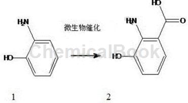 底物2-氨基酚(1)经青霉催化反应,得到产物3-羟基邻氨基甲酸(2)。有多种微生物可以催化此反应,经过大量实验筛选,终确定采用青霉作为催化剂,因为其催化反应的效果好,副产物极少,反应收率高。具体步骤如下:15l发酵罐,即制备微生物发酵液发酵罐,在其发酵液中加入底物2-氨基酚,使浓度为90-95g/l,补加以下成份,使浓度为:直链的10碳醇聚氧乙烯醚为10-12g/l,木糖20-24g/l、蔗糖25-28g/l、糯米粉18-22g/l,121℃高压灭菌30分钟;冷却至33-35℃时,搅拌乳化,进行生物催化反应,反应时间为49-54小时;反应开始时,立即流加浓度为5%的nahco3水溶液,同时流加浓度为1%的盐酸水溶液,调节nahco3与盐酸水溶液的流加速率,维持ph6.4-6.6,所加入的物料均经过灭菌处理;通气比为0.6-0.7v/v,即每分钟通气量为0.6-0.7倍反应液体积,反应结束后,破乳,用0.2倍反应液体积萃取反应液萃取3次,合并有机相,有机相蒸出,得到产物3-羟基邻氨基甲酸,反应转化率98.1-99.6%,产品收率95.9-97.1%。3-羟基邻氨基甲酸进一步与盐酸反应制备生成3-羟基邻氨基甲酸盐酸盐。