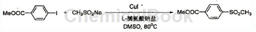具体步骤如下:在一个反应管内,加入262mg对碘甲酸乙酯(mw=262.04,1.0mmol),然后加入153mg甲基业磺酸钠盐(mw=102.09,1.2mmol,含量80%),28mgl-脯氨酸钠盐(mw=137.05,0.2mmol),19mgcui(mw=190.45,0.1mmol),2mldmso作为溶剂,在氮气保护下,于80℃油浴中反应36小时,冷却,加入4毫升水,每次用10毫升萃取,重复三次,萃取液用饱和食盐水洗,无水钠干燥后,过滤,滤液减压蒸馏,过硅胶柱分离(淋洗液石油醚∶=3∶1),得到158mg产物4-甲磺酰基甲酸甲酯,产率77%。