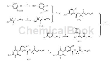 氟丙嘧草酯(英文通用名butafenacil,商品名inspire) 是先正达公司开发的一种非选择性脲嘧啶类除草剂。它于2001年上市,主要用于葡萄园、棉花及非耕地防除禾本科杂草、阔叶杂草和莎草等,苗前和苗后除草用量均为75~150 g/hm2 。合成反应式如下: