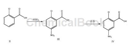 1) 将溶剂浓和邻氯甲酸投入反应容器中,控温-5~5℃滴加硝酸,滴毕保温反应1~3h,反应完成后冰水淬灭,然后经搅拌、离心、水洗、烘干得到2-氯-5-硝基甲酸;
