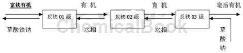 (2)反萃:如图1所示,为免皂化的反萃铁方法流程图,富铁有机萃取剂p204(铁离子含量为15g/l),由反铁01级进入萃取箱,同时草酸钠溶液从草酸钠低位槽由反铁03级进入,草酸钠溶液与负载铁离子的有机萃取剂的流量比为2.9:1,经过3级反萃后,得到皂化后有机萃取剂,进入系统循环使用,草酸铁钠由水相排出系统,并可以作为副产品外卖。具体使用时,可根据有机中含铁量,设置反铁级数。富铁有机萃取剂经反萃后fe<15mg/l。