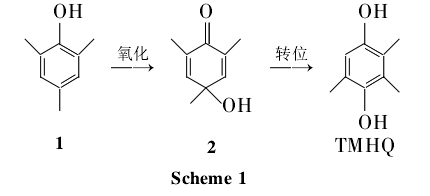 均三甲酚法是以naoh为催化剂,均三甲酚(1)在高压氧气中氧化为4-羟基-2,4,6-三甲基-2,5环己二烯酮(2); 2于250℃经甲基转位后再经还原合成tmhq ( scheme 1),总收率47 % 。 l可由酚甲基化合成,也可从合成2,6-二甲基酚的副产物中进行提取,故均三甲酚法具有较大的实用价值。