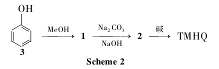 酚(3)和甲醇[n(酚):n(甲醇)=1 :5]分别气化并混合后,进入二段固定床等温反应器,于450℃一500℃进行气固相催化反应,经冷凝·蒸馏得1; 1在碳酸钠和氢氧化钠溶液中通入蒸汽发生bamherger转位反应得2;后用碱处理得tmhq (scheme 2),总收率60% 。