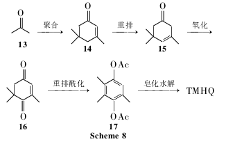 异佛尔酮氧化法是丙酮(13)首先聚合为异佛尔酮(14) ; 14经重排氧化得氧代异佛尔酮(16) ; 16经酞化、重排反应得三甲基氢醒二脂(17);17经皂化、水解得tmhq( scheme 8)。