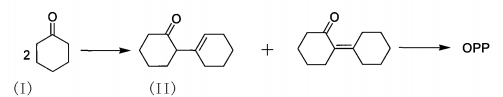 其中2‑(1‑环己烯基)环己酮(i)和2‑环己亚烷基环己酮(ii)是同分异构体,合成上不必将其分离,可以直接在催化剂作用下脱氢生成opp。该方法原料来源方便、成本低,同时反应生成水和氢气,污染少,适合工业化生产。