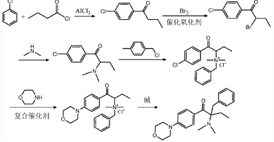 (1)该工艺是以氯为原料,经傅-克反应、溴化、二甲胺取代溴、季铵盐合成、重排、吗啉取代氯后得到369产品。该工艺看似生产成本较低,但吗啉取代氯这一过程中要使用高温高压危险工艺,副产物多且收率较低。
